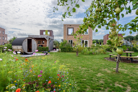 Vanuit de uitgebouwde woonkamer komt u middels de grote schuifpui in de fraai en gezellig aangelegde achtertuin, gelegen op het Noordwesten. Met deze ligging heeft u vanaf begin van de middag tot het einde van de dag zon in de tuin.